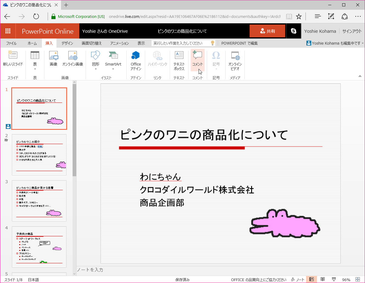 - OneDriveにアクセスするので、サインインを行い、プレゼンテーションを編集します(サインアウト状態だとゲスト編集となります)。PowerPointを持っていなくてもオンライン上で編集可能です。