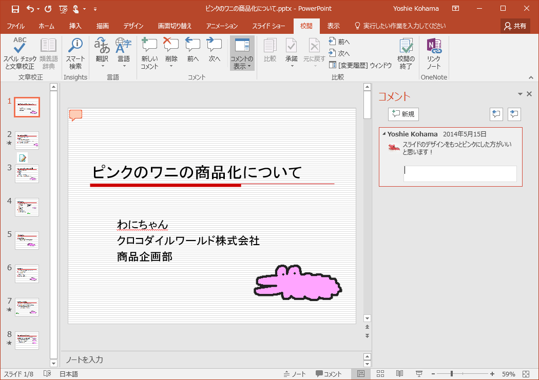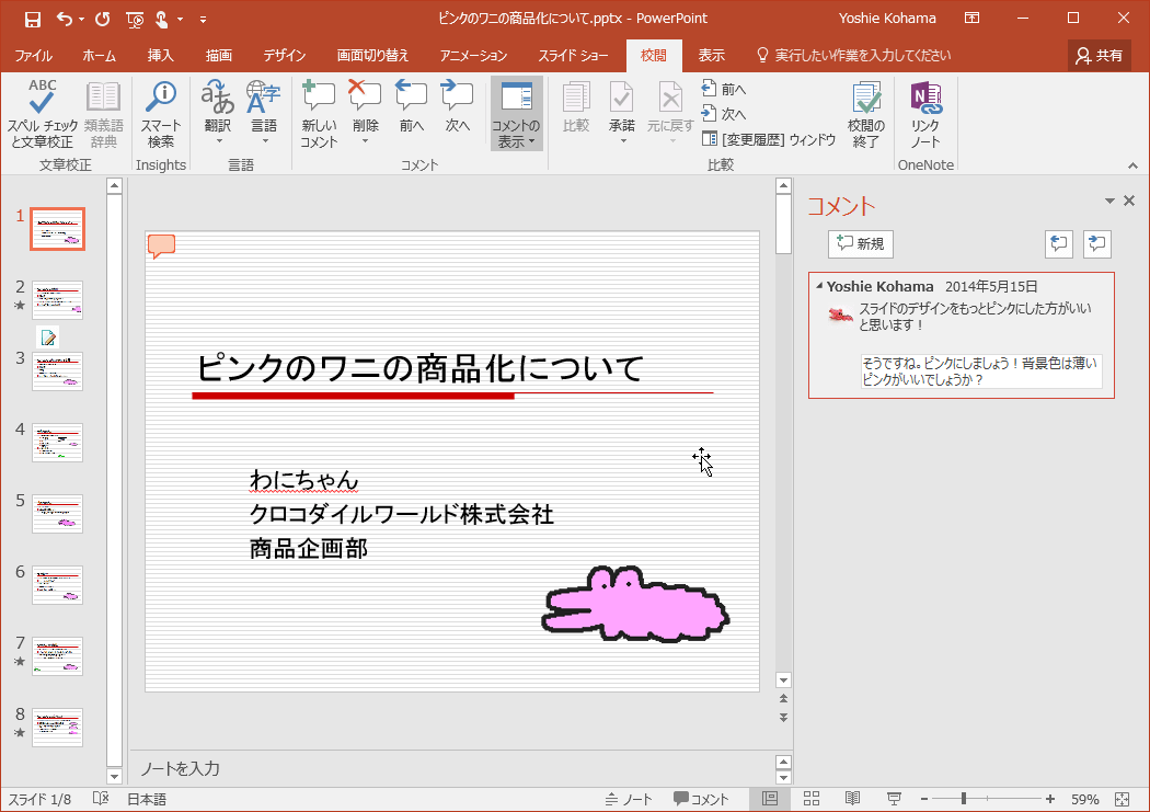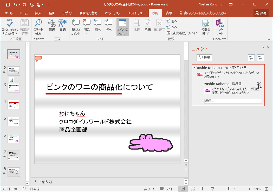 PowerPoint 2016で返信したいコメントの右上の返信アイコンをクリックすると、そのコメントに返信ができます。返信コメントを削除するには、その返信コメントを選択して、[コメントの削除]をクリックするとOKです。