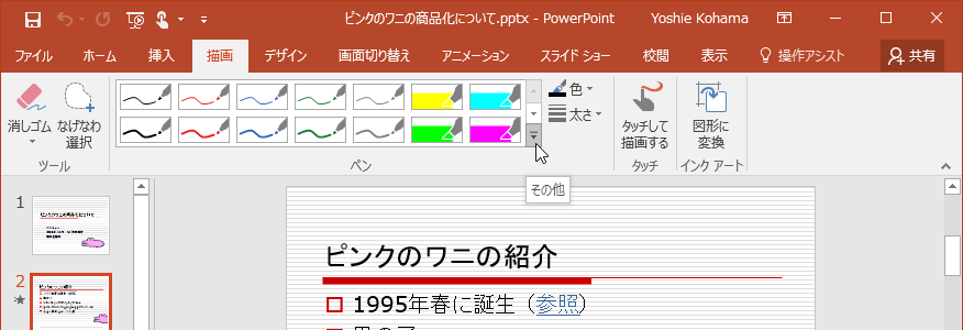 - インクのオプションを選んだら、スライドの中で自由に描画、強調、書き込みを始めましょう。