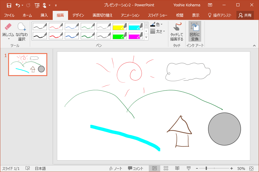 PowerPoint 2016でインク描画をくっきりとした完全な正多角形や円に自動的に変換するには、[描画]タブの[図形に変換]をオンにして、手描きやペンで図形を描きます。