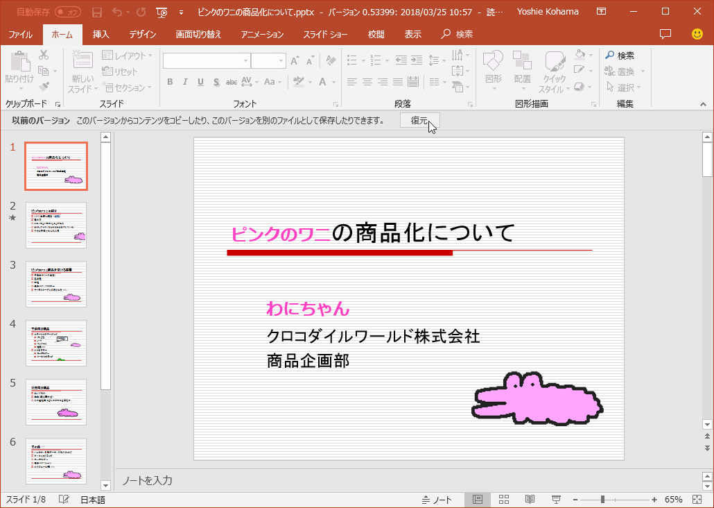 OneDrive上のプレゼンテーションを以前のバージョンに復元するには、画面右上の[バージョン履歴]アイコンまたは、タイトルバーをクリックして[バージョン履歴の表示]一覧から元に戻したいバージョンの[バージョンを開く]をクリックして、情報バー右側の[復元]ボタンをクリックします。この操作により、その前のバージョンが現在のバージョンとして設定されます。