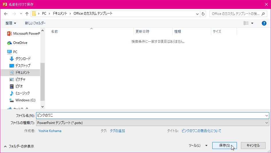 - [プレゼンテーションファイルの種類]一覧から[テンプレート (*.potx)]を選択して[名前を付けて保存]をクリックします。