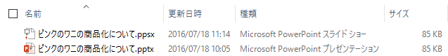 通常、ファイルをダブルクリックすると、PowerPointが起動してそのファイルが開くようになりますが、スライドショーとして保存することによって、ダブルクリックすることでスライドショーが実行されるようになります。実質、拡張子が「*.pptx」から「*.ppsx」に変わっただけで、中身は変わりません。