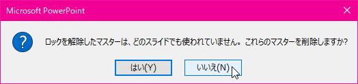 マスターのロックを解除すると、どのスライドでも使われていない場合、マスターを削除するかどうかのメッセージが表示されます。ここではマスターを削除しないので[いいえ]ボタンをクリックします。