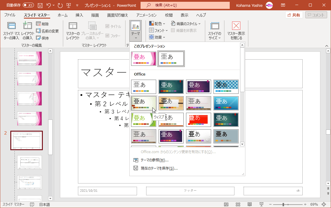 保持されたスライドマスターを選択し、組み込みのテーマから任意のテーマをクリックします。