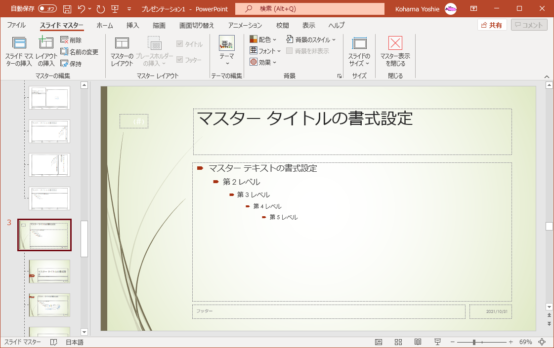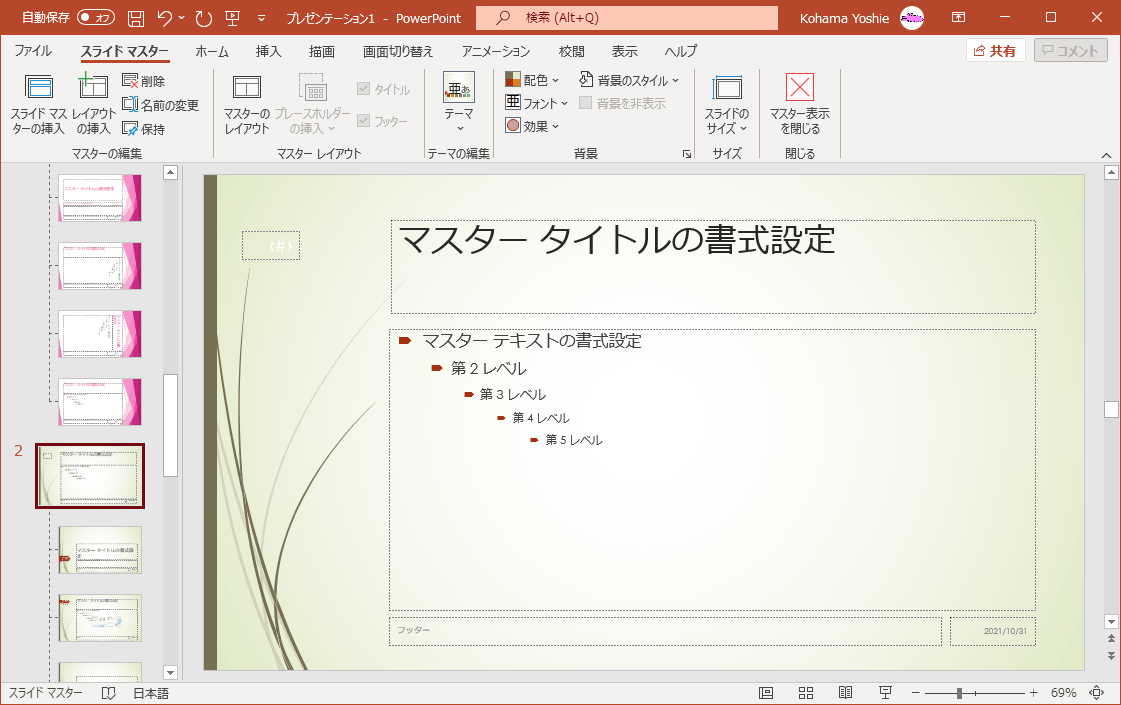 注意すべき点として、保持されたスライドマスターにはテーマの変更ができないということです。保持されたスライドマスターのテーマを変更するには、あらかじめマスターのロックを解除する必要があります。