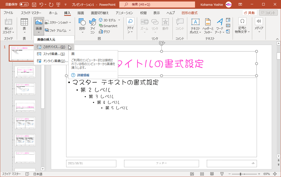 画像の挿入元として、コンピューター、ストック画像ライブラリ、またはオンラインソースから選択します。ここでは、コンピューターにダウンロードした画像を挿入するので、[挿入]タブを開き、[画像]をクリックして、[このデバイス...]を選択します。