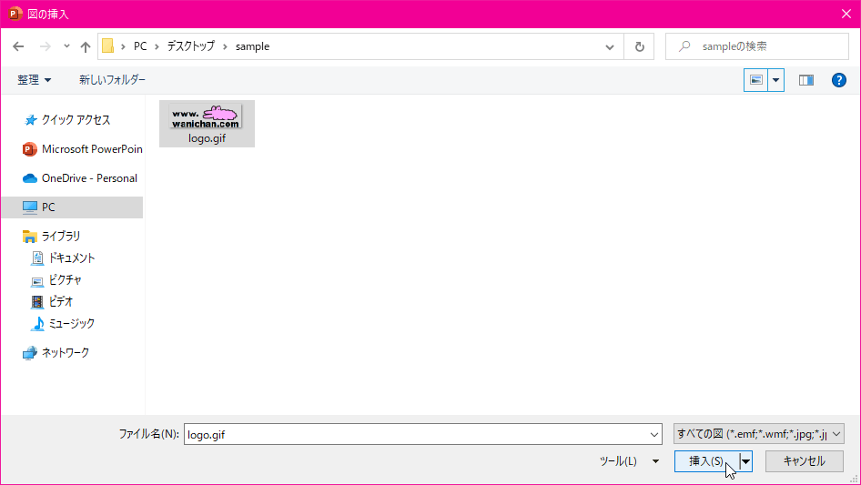 - ロゴ画像を選択して[挿入]ボタンをクリックします。