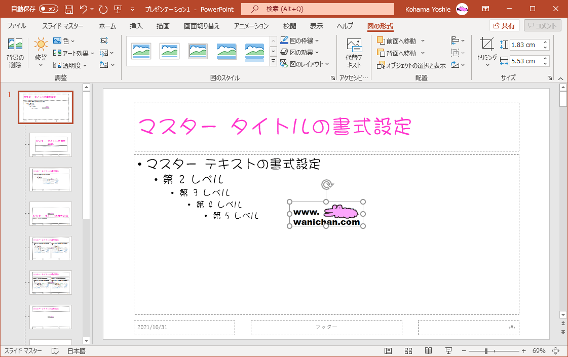 すべてのスライドの所定の位置にロゴ画像を配置するには、スライドマスターに挿入する必要があります。一番上の共通スライドを選択して挿入すると、すべてのレイアウトに反映されます。