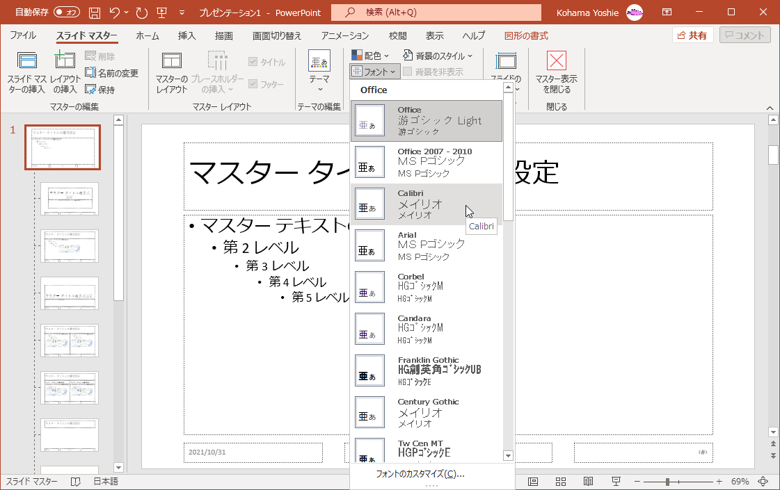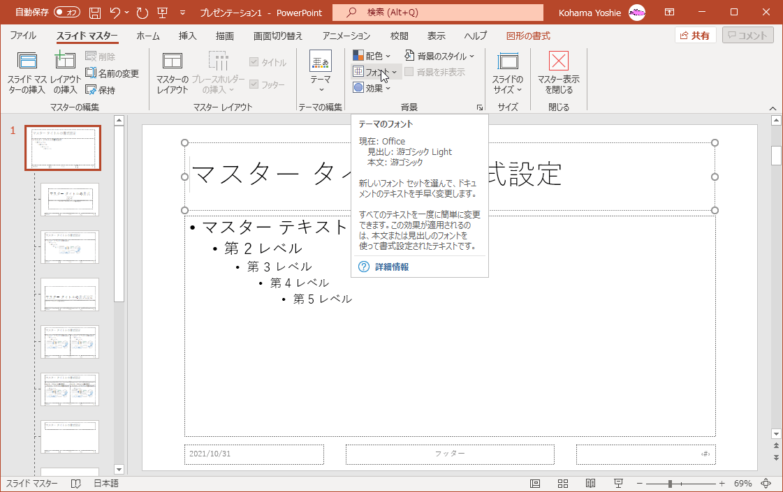 スライドマスターのフォントを変更するには