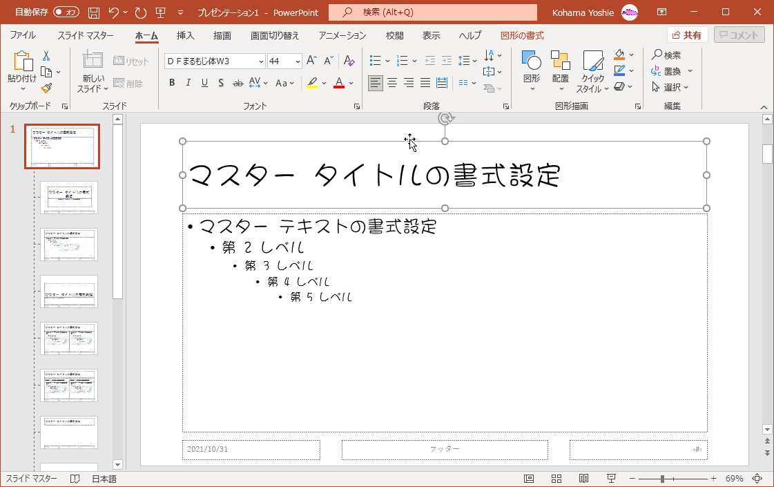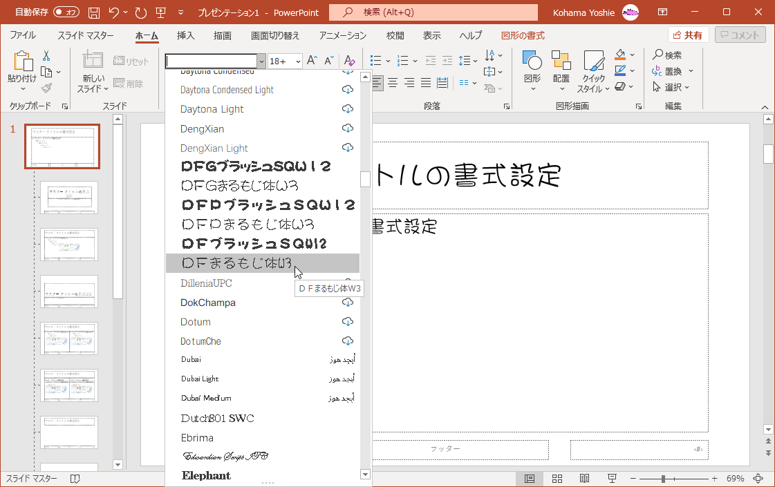 - スライドマスターのフォントセットが選択され、フォントが置き換わりました。