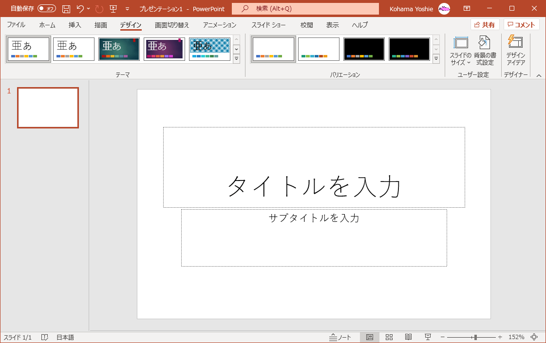 既定のスライドサイズはワイド画面になります。はがきサイズに変更するには、[デザイン]タブを開き、[ユーザー設定]グループの[スライドのサイズ]をクリックして、[ユーザー設定のスライドのサイズ]を選択し、[スライドのサイズ]ダイアログボックスの[スライドのサイズ指定]プルダウンより[はがき]を選択します。