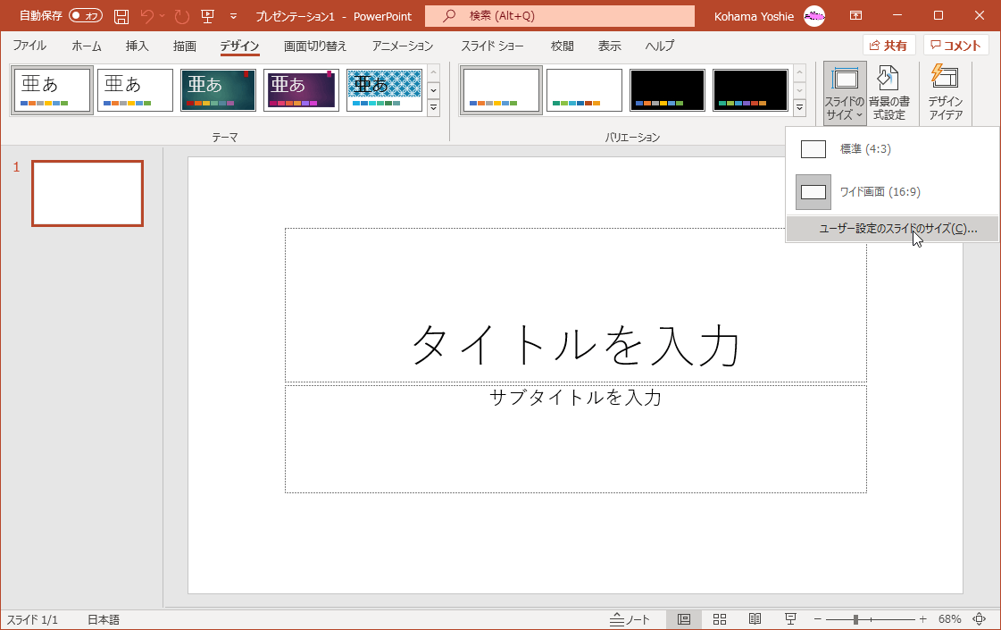 - [デザイン]タブを開き、[ユーザー設定]グループの[スライドのサイズ]をクリックして、[ユーザー設定のスライドのサイズ]を選択します。