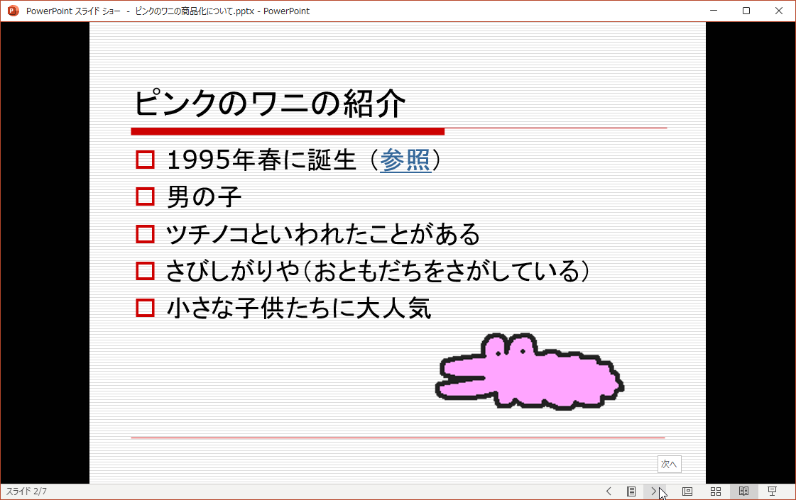 - スライドをクリックするか、右下の[次へ]ボタンをクリックすると、次のスライドに進みます。