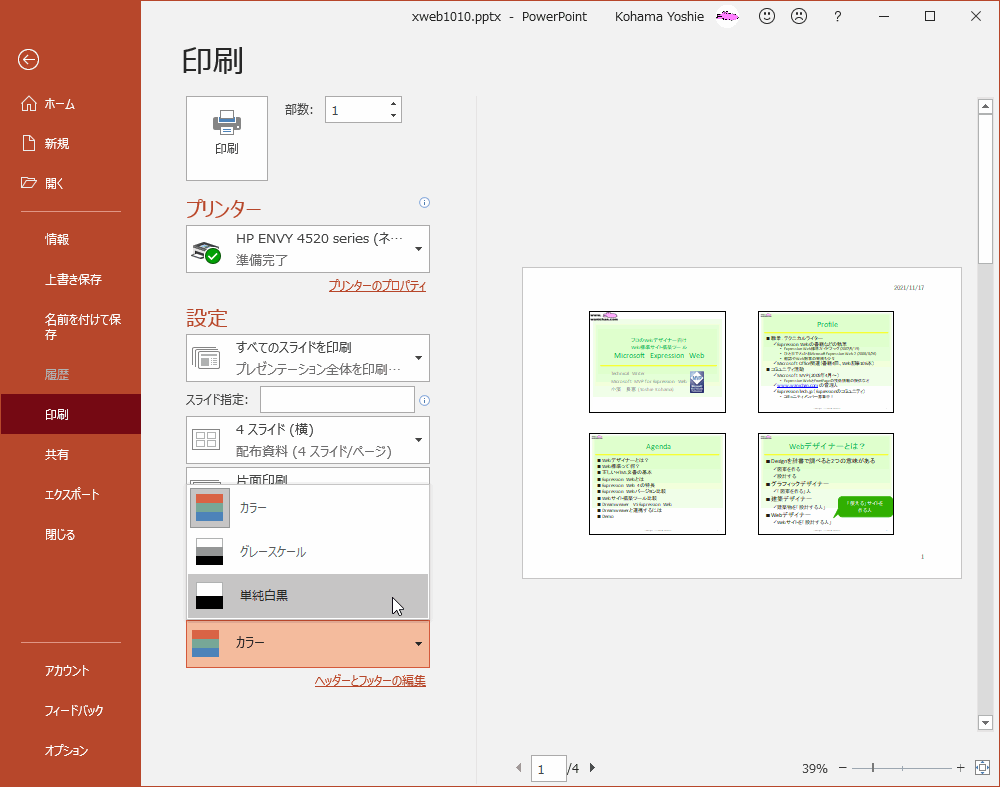 既定ではカラー印刷されますが、グレースケールや単純白黒で印刷するには、[ファイル]タブの[印刷]画面の[カラー]を[グレースケール]や[単純白黒]に変更して[印刷]ボタンをクリックします。「グレースケール」の場合は配布資料の背景がなくなりますが、「単純白黒」印刷にすると、背景を含めて全体が白黒で印刷されます。