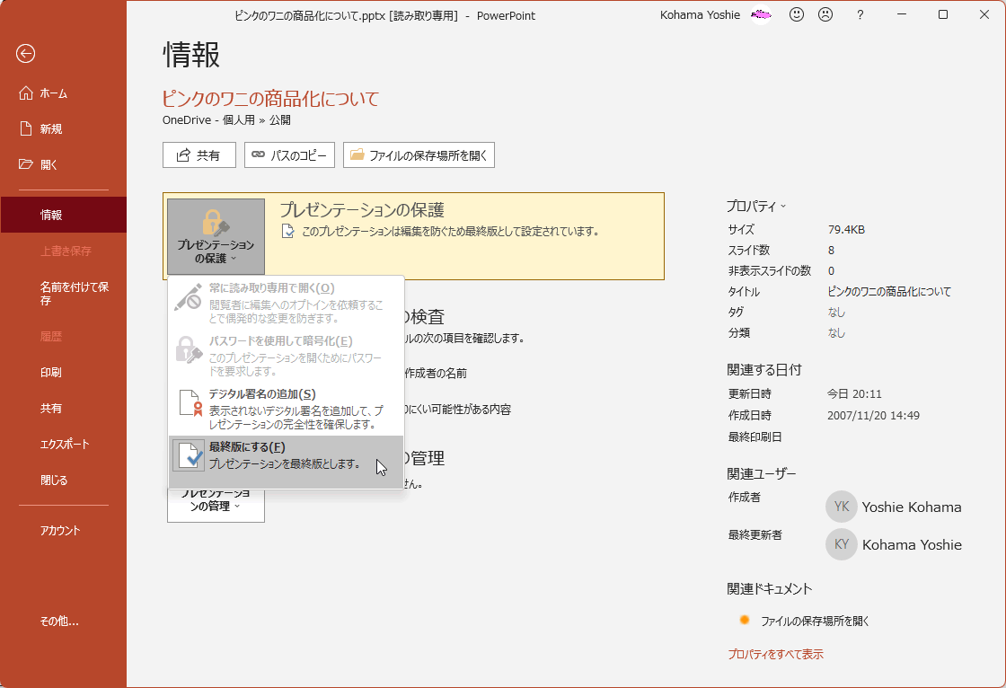 プレゼンテーションを最終版にし、読み取り専用に設定するには、[ファイル]タブを開き、[情報]タブの[プレゼンテーションの保護]をクリックして[最終版にする]を選択します。最終版のドキュメントの編集を有効にするには、「最終版」を知らせる情報バーの[編集する]ボタンをクリックするか、[ファイル]タブを開き、[情報]タブの[プレゼンテーションの保護]をクリックして[最終版にする]を選択します。