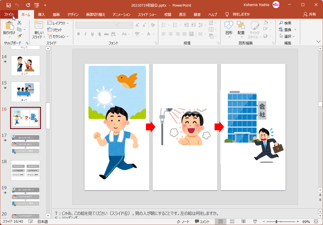- 対象となるプレゼンテーションを開き、[ファイル]タブを選択します。