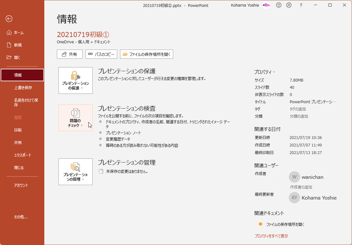- ホーム画面が表示されたら[情報]をクリックし、[ドキュメントの検査]の[問題のチェック]ボタンをクリックします。