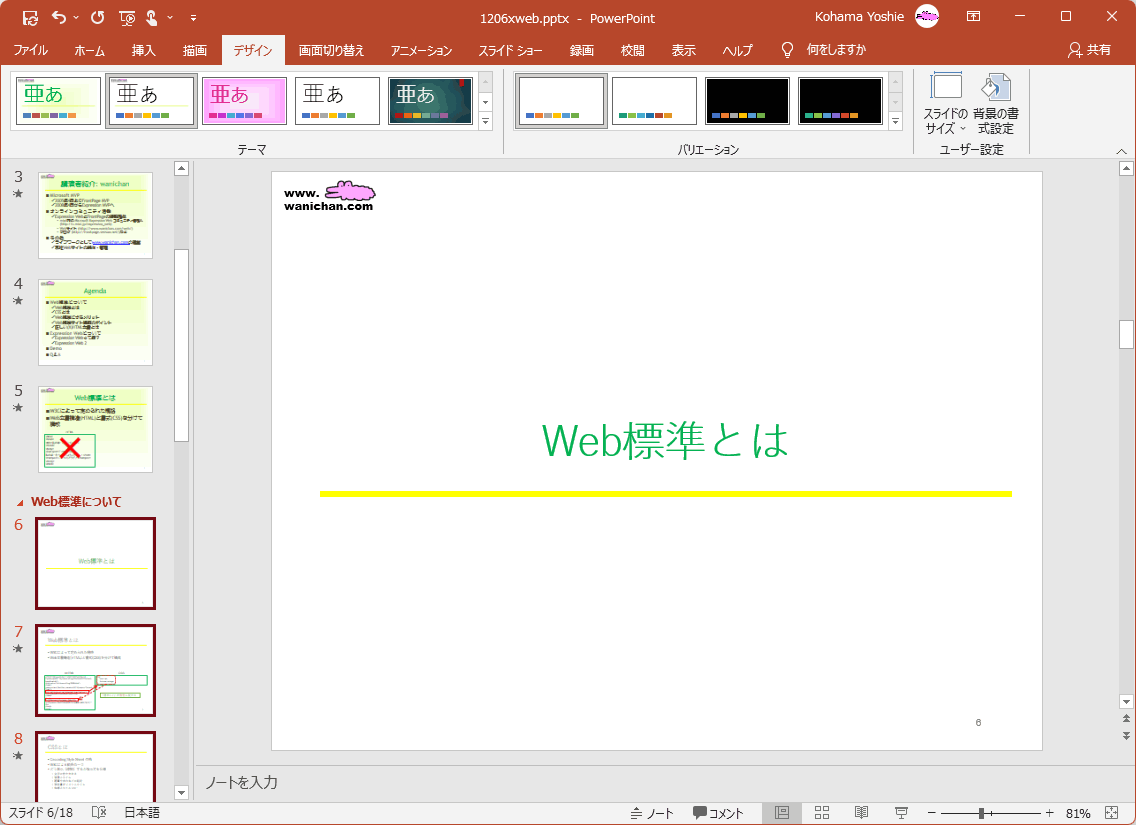 - セクションを選択して[デザイン]タブを開き、[バリエーション]一覧より適用したいバリエーションを選択します。