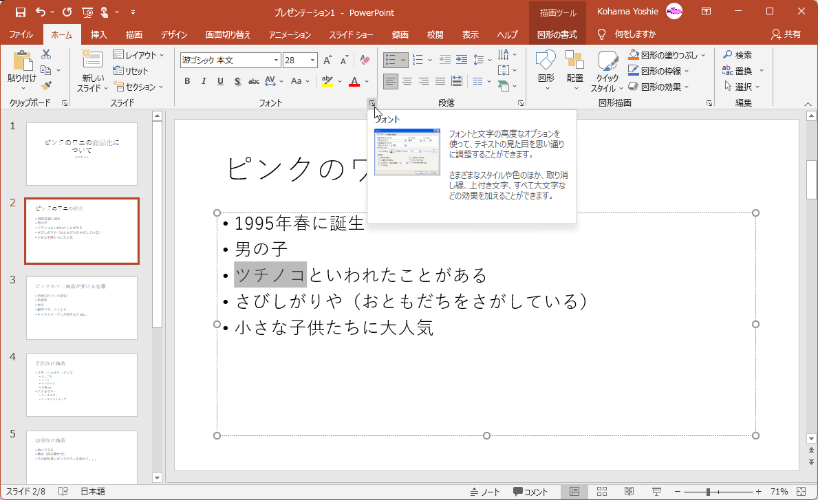 - 選択した文字列をベースラインの上にして、フォント サイズを小さくするには、選択したテキストを変更し、[ホーム]タブの[フォント]グループ右下のダイアログボックス起動ツールをクリックします。