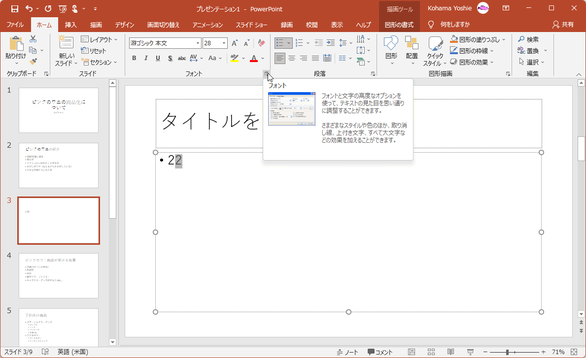 タイトルの文字列を選択して[ホーム]タブの[フォント]グループの