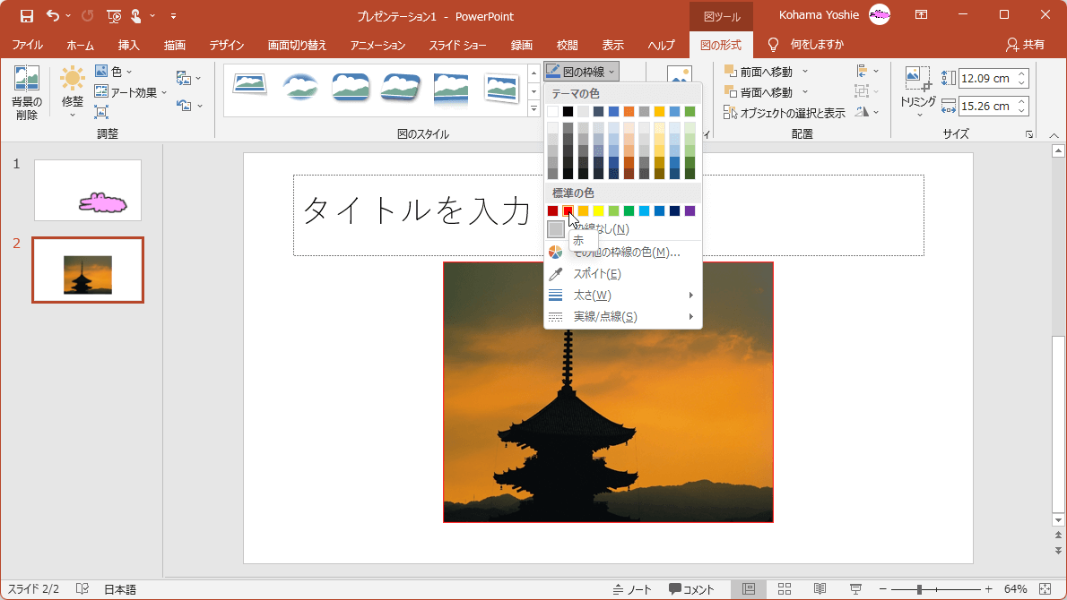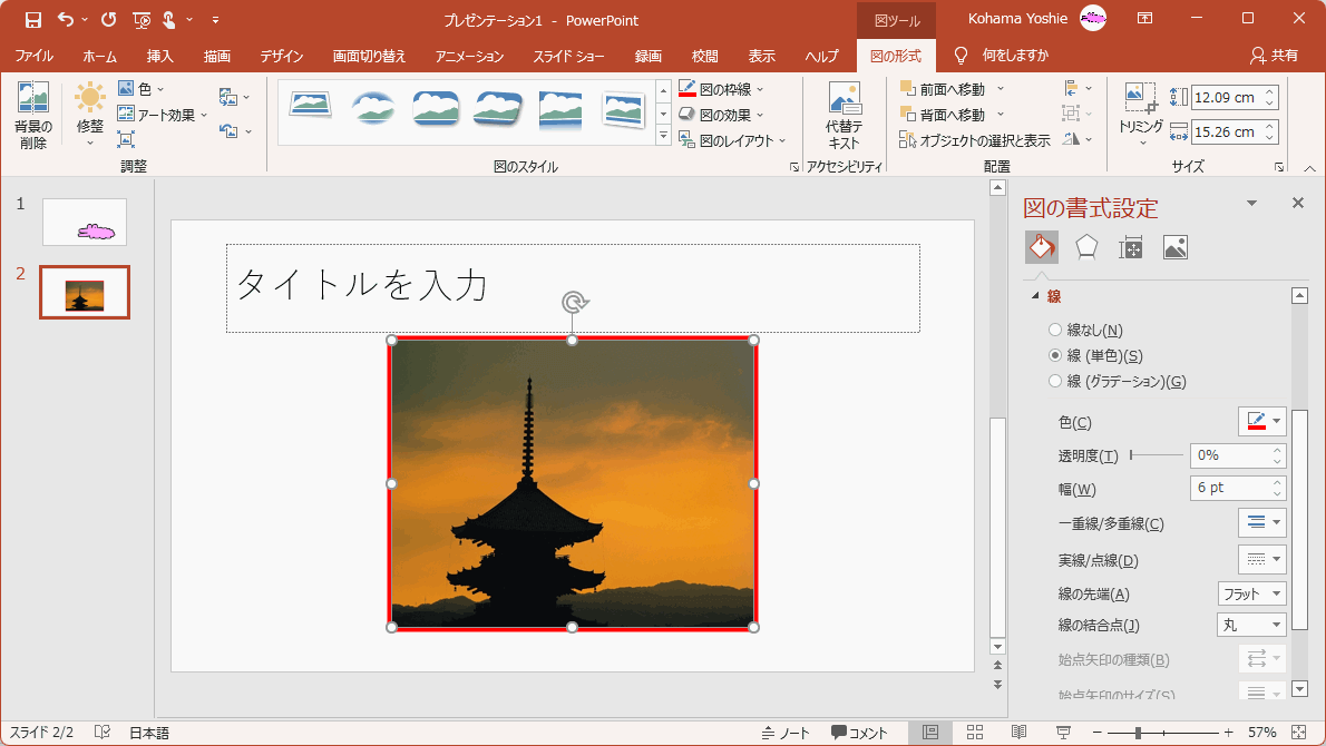 - [図のスタイル]グループから[図の枠線]をクリックします。