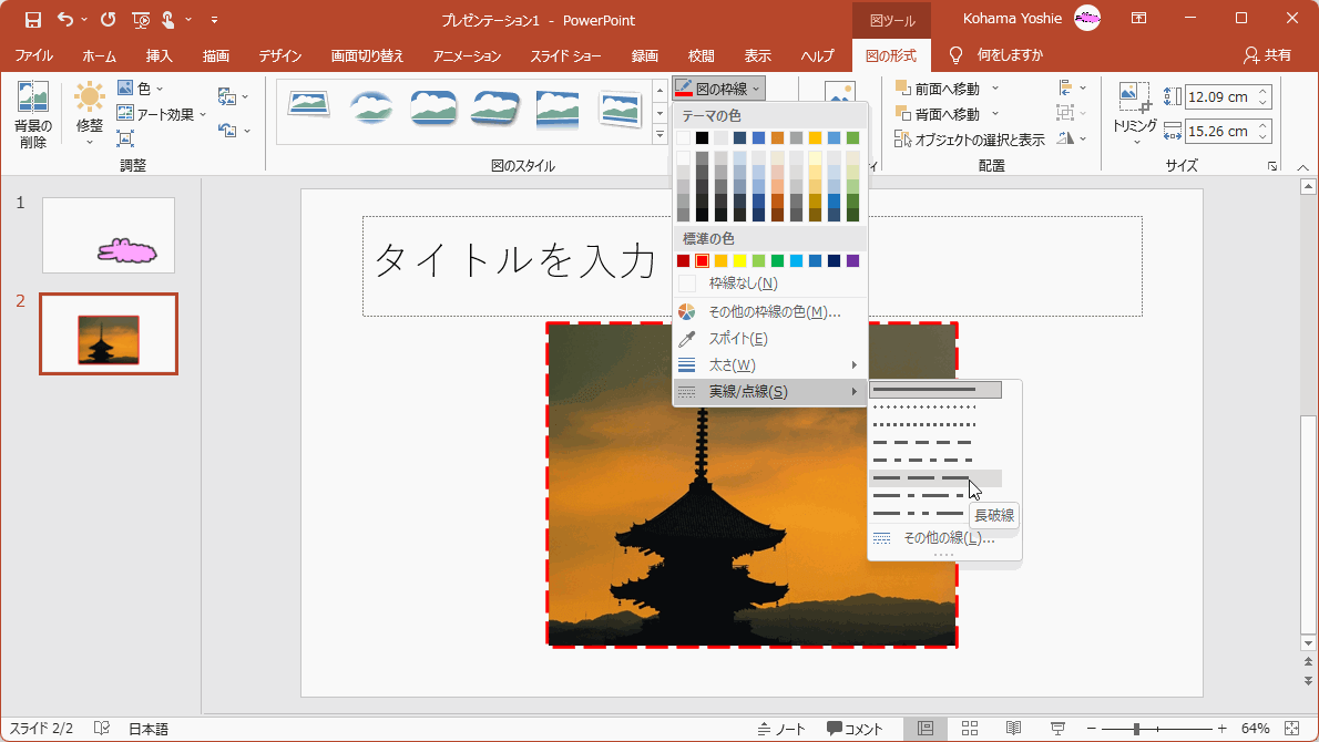 - [図の枠線]の▼をクリックし、[実線/点線]をポイントして、一覧から枠線の種類を選択します。