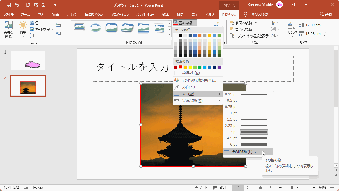 - [図の枠線]の▼をクリックし、[太さ]をポイントして、一覧から太さを選択します。