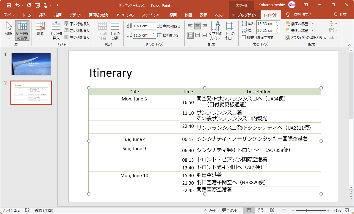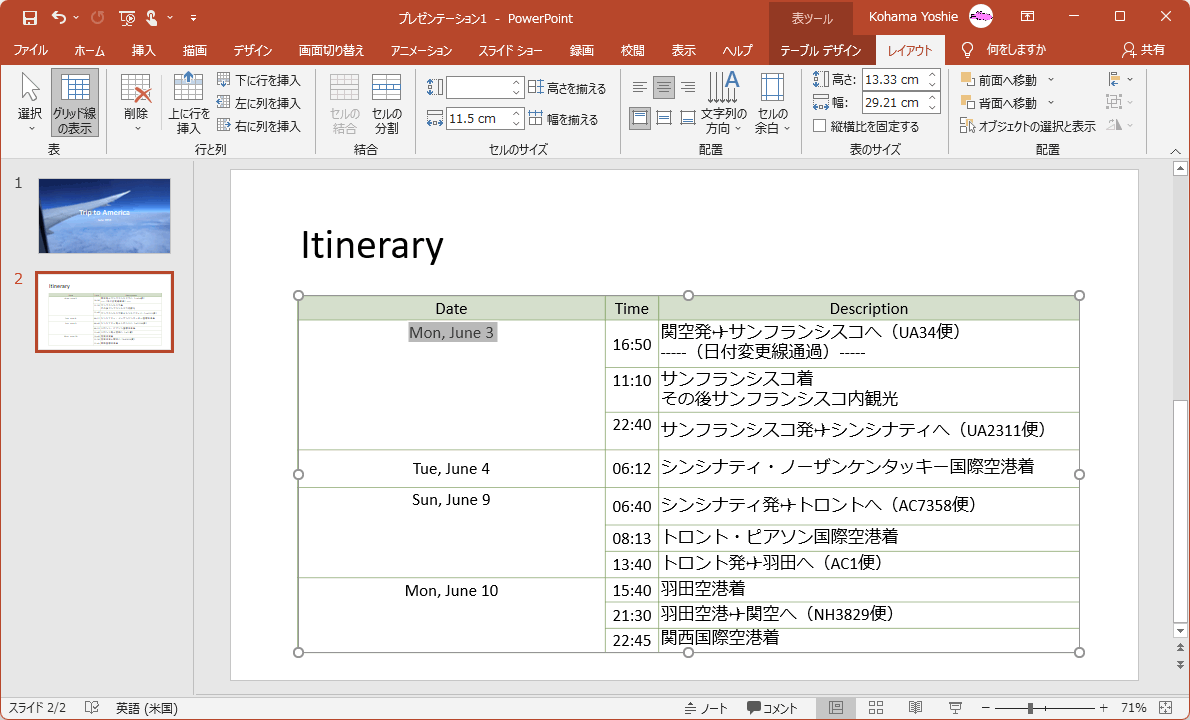 - 一つにしたい複数のセルを選択し、[表ツール]の[レイアウト]タブを開きます。