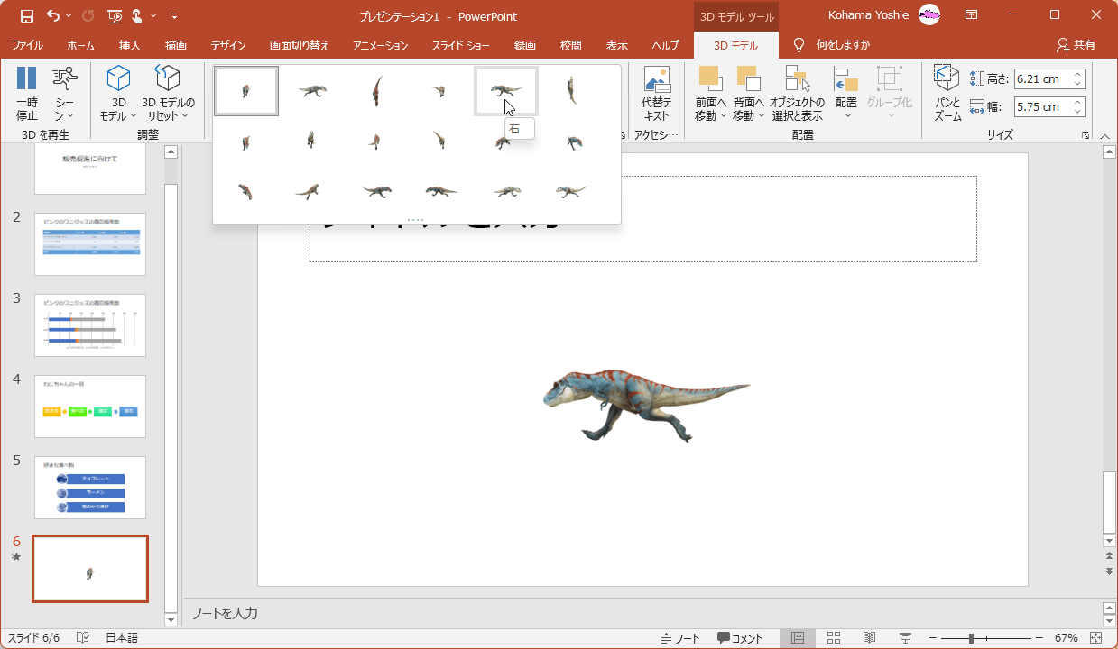 対象となる3Dモデルを選択し、[3Dモデル]タブの[3Dモデルビュー]一覧から選択します。ここでは、▼をクリックして一覧表示します。
