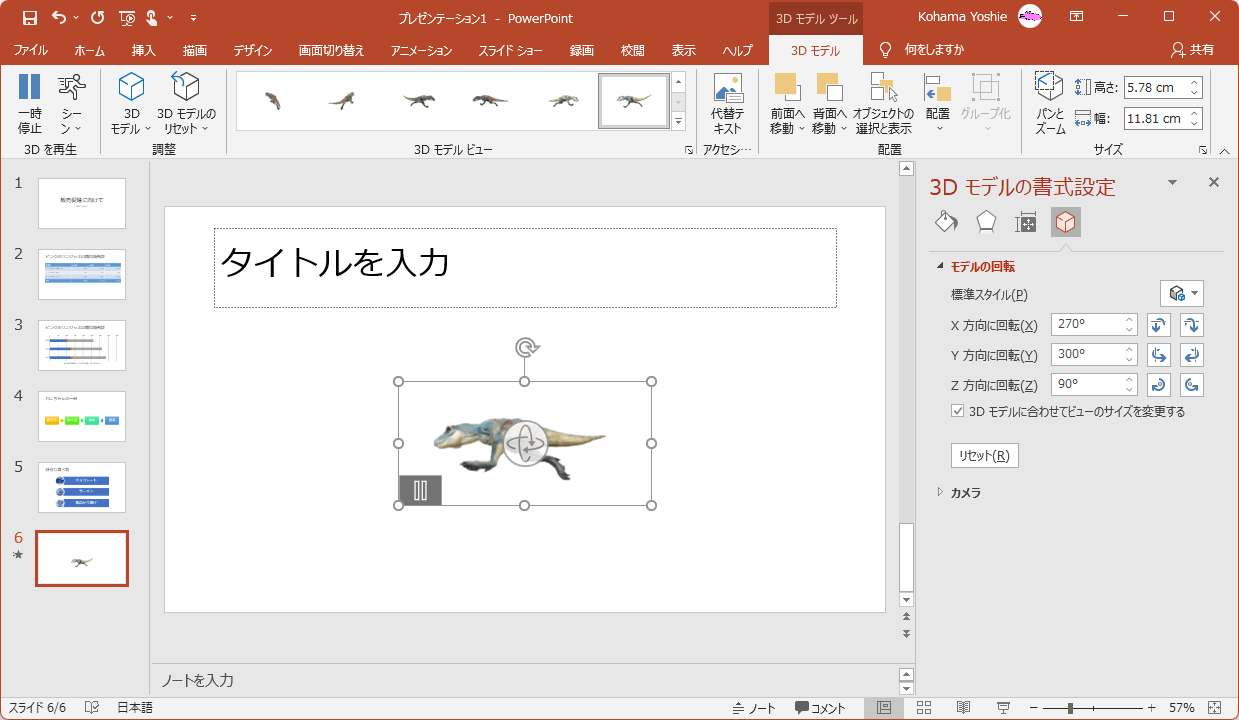 - [3Dモデルの書式設定]ウィンドウの[3Dモデル]タブを開き、X、Y、Z方向に数値で調整するか、それぞれの右側の90度ごと回転ボタンを使用することで、3Dモデルが回転します。この際、[3Dモデルに合わせてビューのサイズを変更する]にチェックを入れることで、3Dモデルがビューのサイズ内に常に収まるようになります。