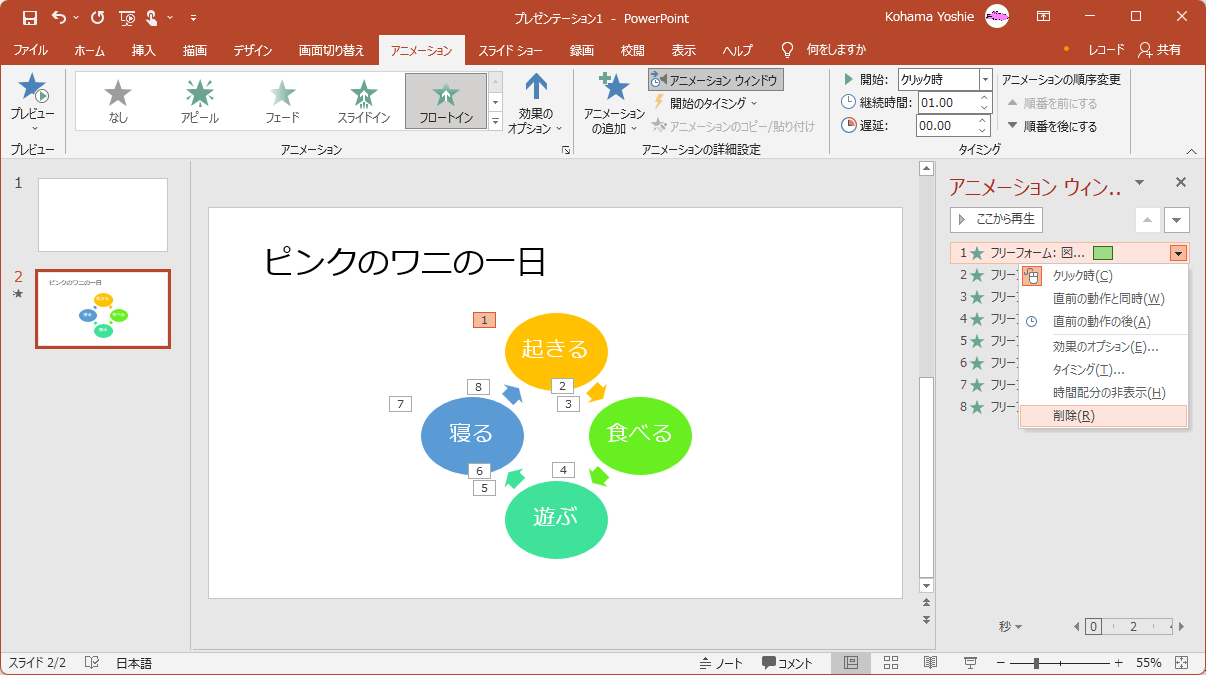 アニメーションウィンドウから削除したいアニメーションを選択してDeleteキーを押すか、▼をクリックして一覧より[削除]を選択します。