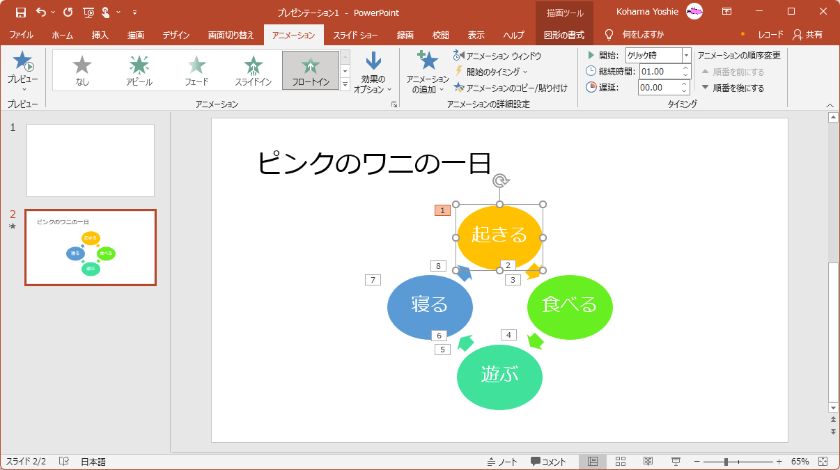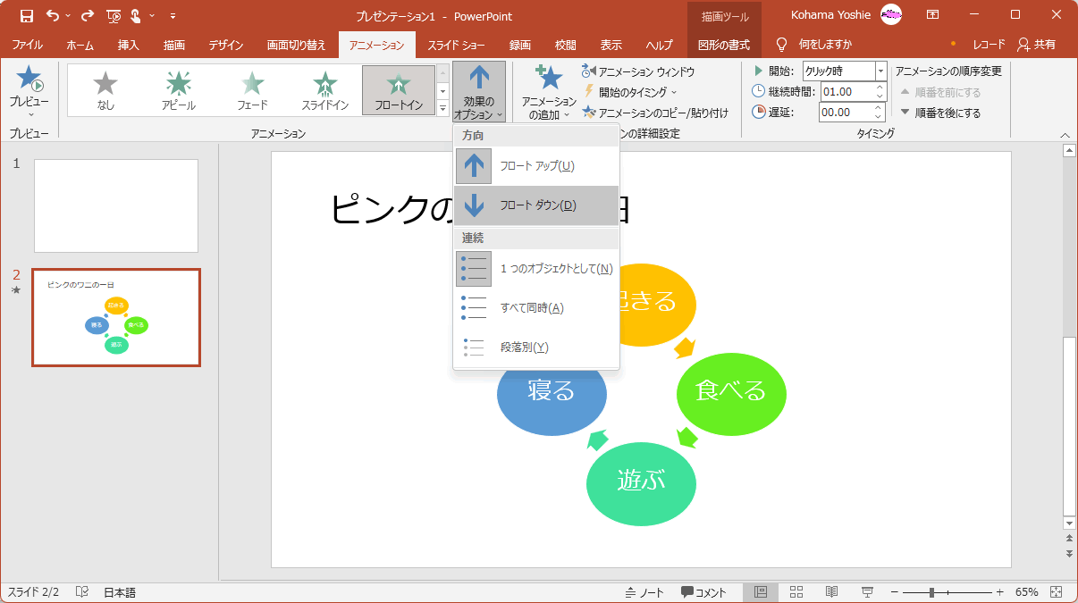 選択したオブジェクトに適用されたアニメーションの方向を変更するには、[アニメーション]タブの[効果のオプション]をクリックし、方向を選択します。