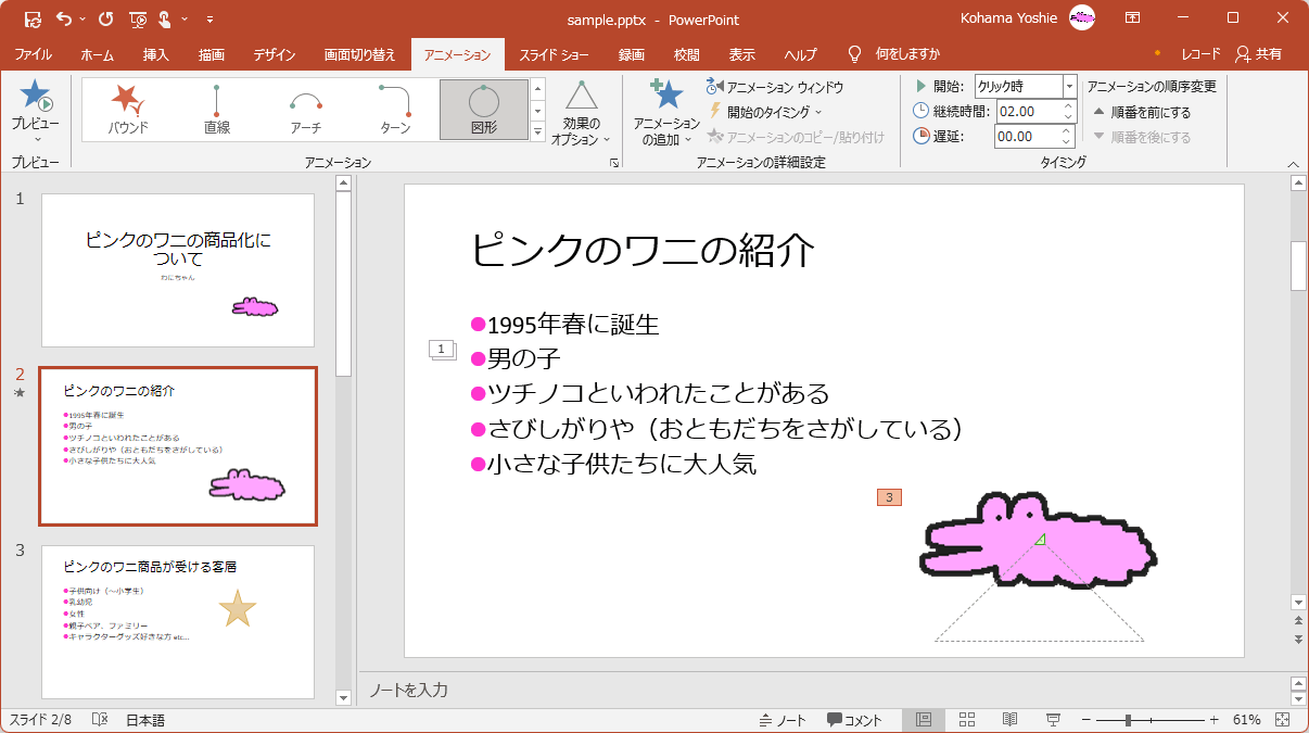 アニメーション軌跡の図形は「円」のほか、「ひし形」「正三角形」「六角形」「八角形」「平行四辺形」「五角形」「直角三角形」「四角形」「台形」が用意されています。ほかの図形に変更するには、アニメーション軌跡を選択し、[アニメーション]タブの[効果のオプション]をクリックして、変更したい図形を選択します。