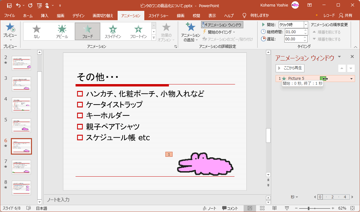 継続時間とは、そのアニメーション効果が終わるまでの時間です。その継続時間を長くすることで、アニメーション効果の速度が遅くなります。