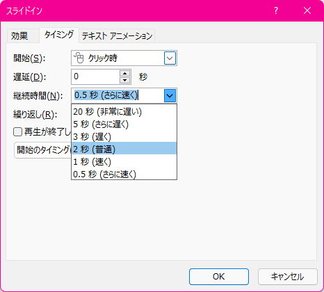 - [タイミング]タブを開き、[継続時間]ボックス一覧から選択します。