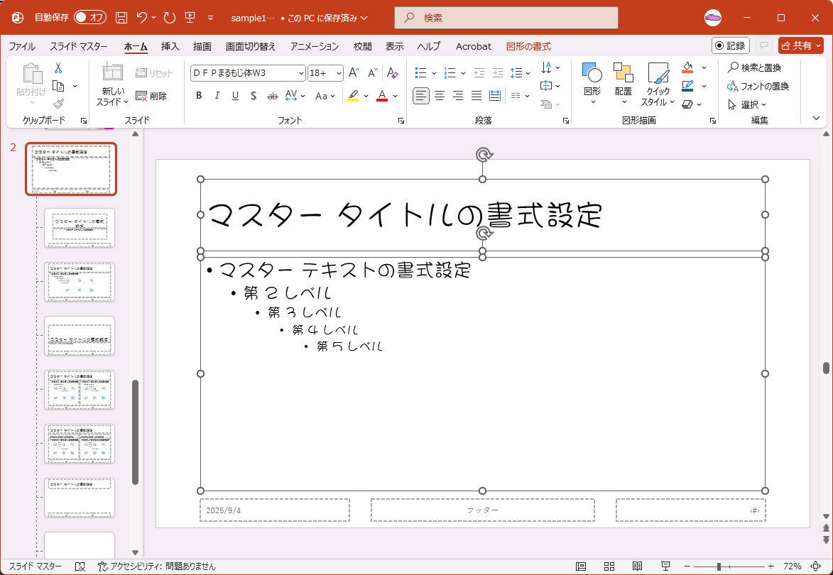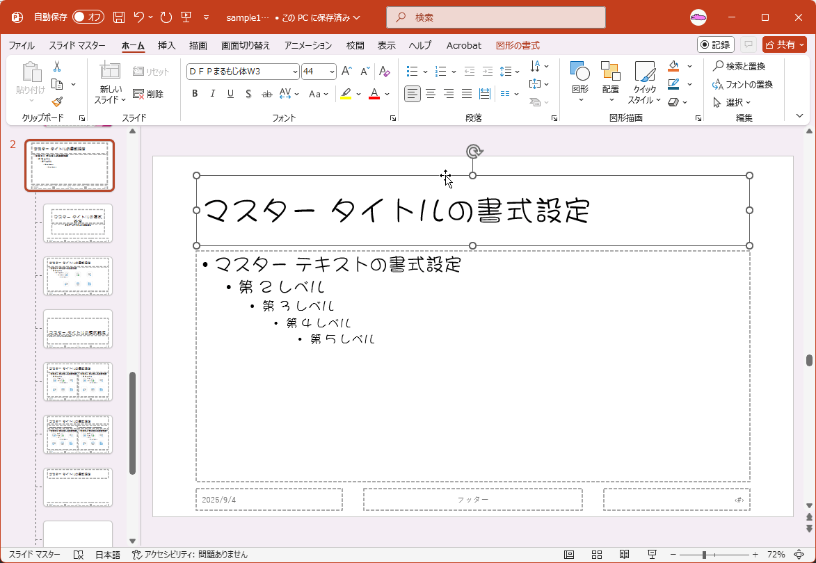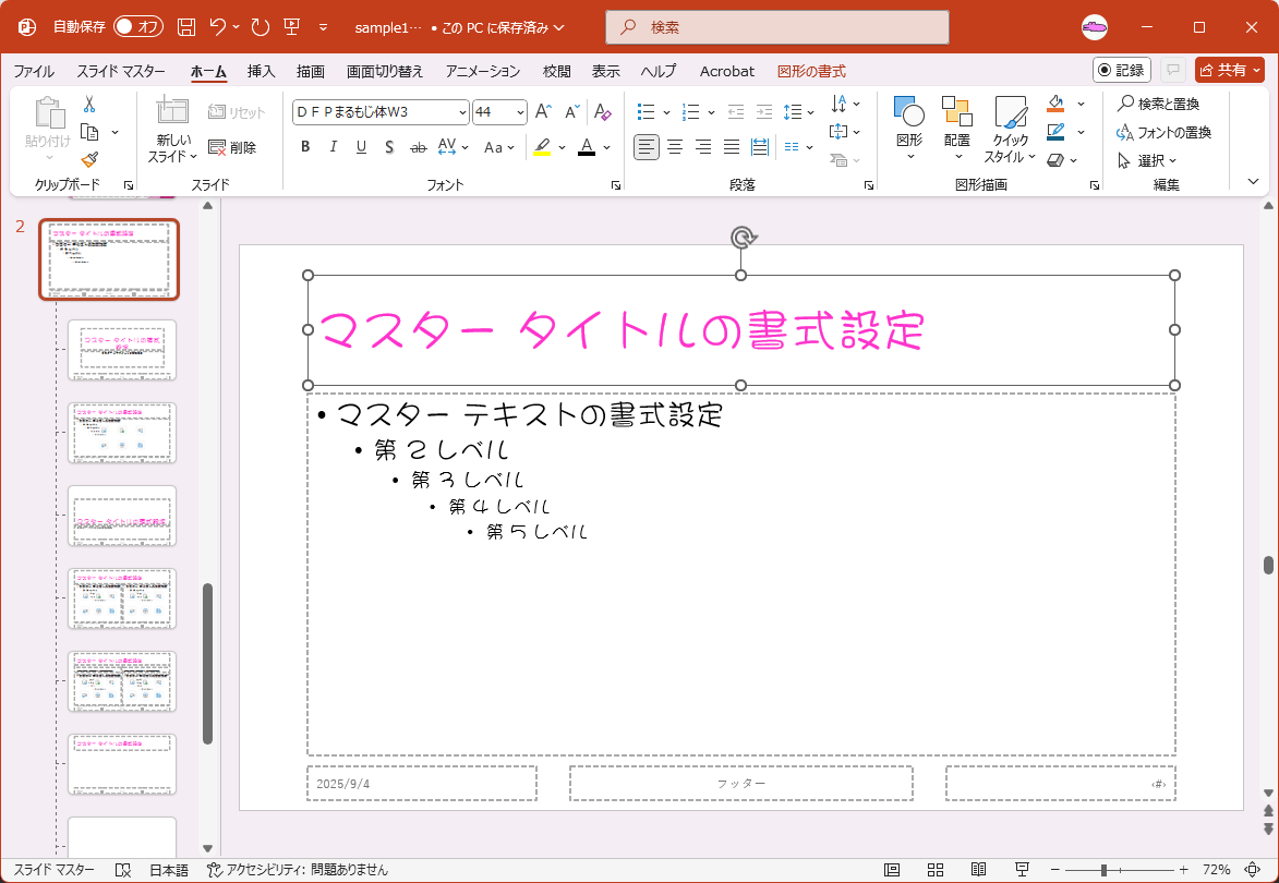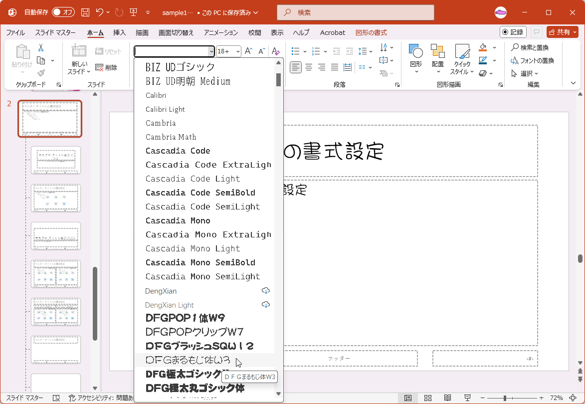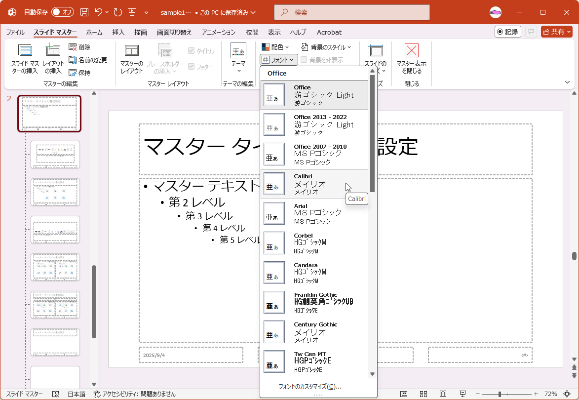 - スライドマスターのフォントセットが選択され、フォントが置き換わりました。