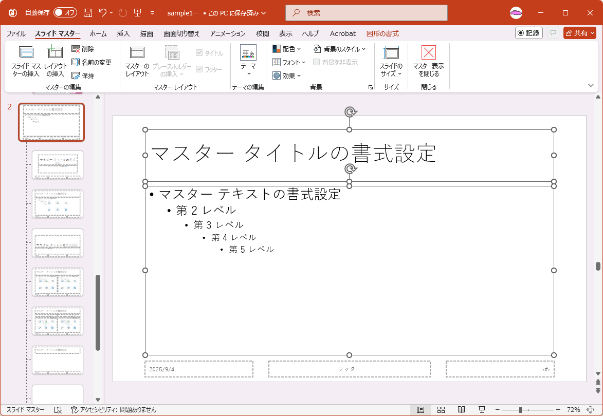 - スライドマスターを選択して、タイトルプレースホルダーを選択します。