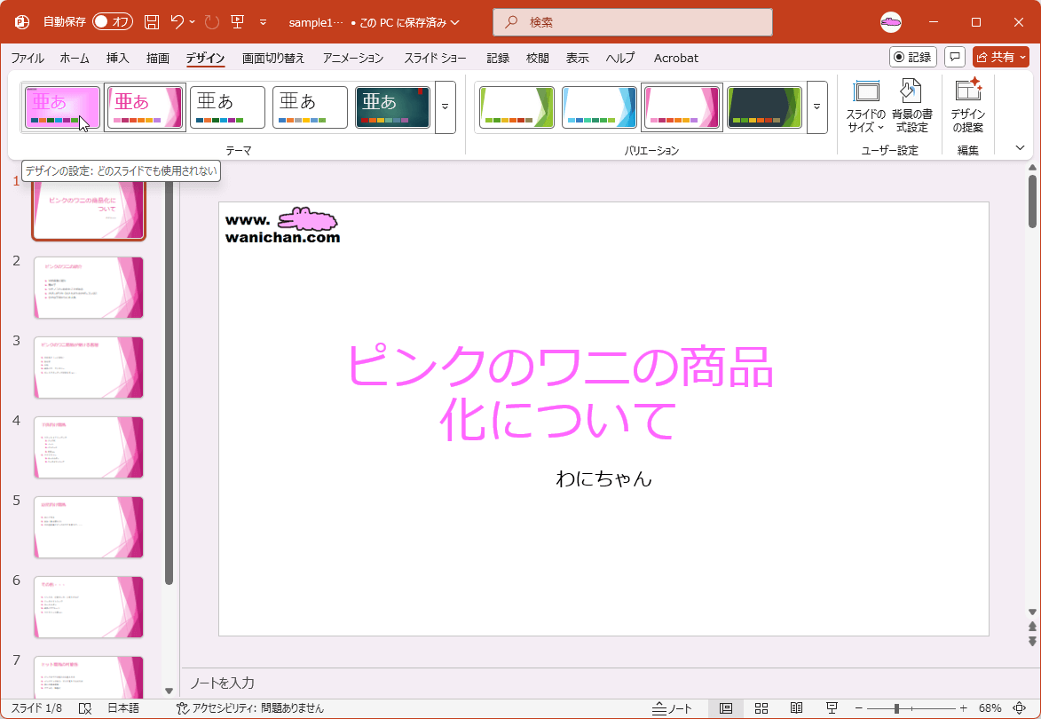 - [デザイン]タブを開き、適用したいテーマを選択します。