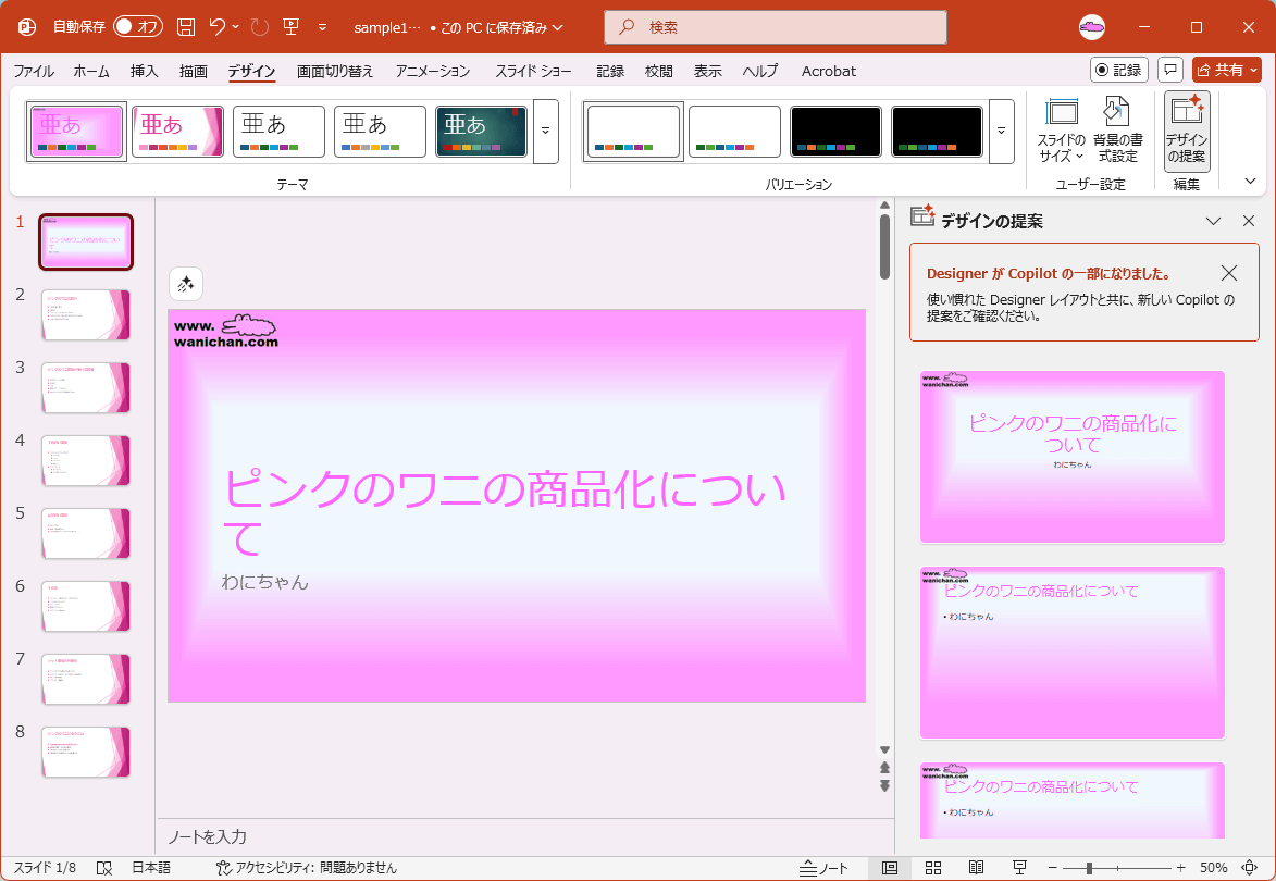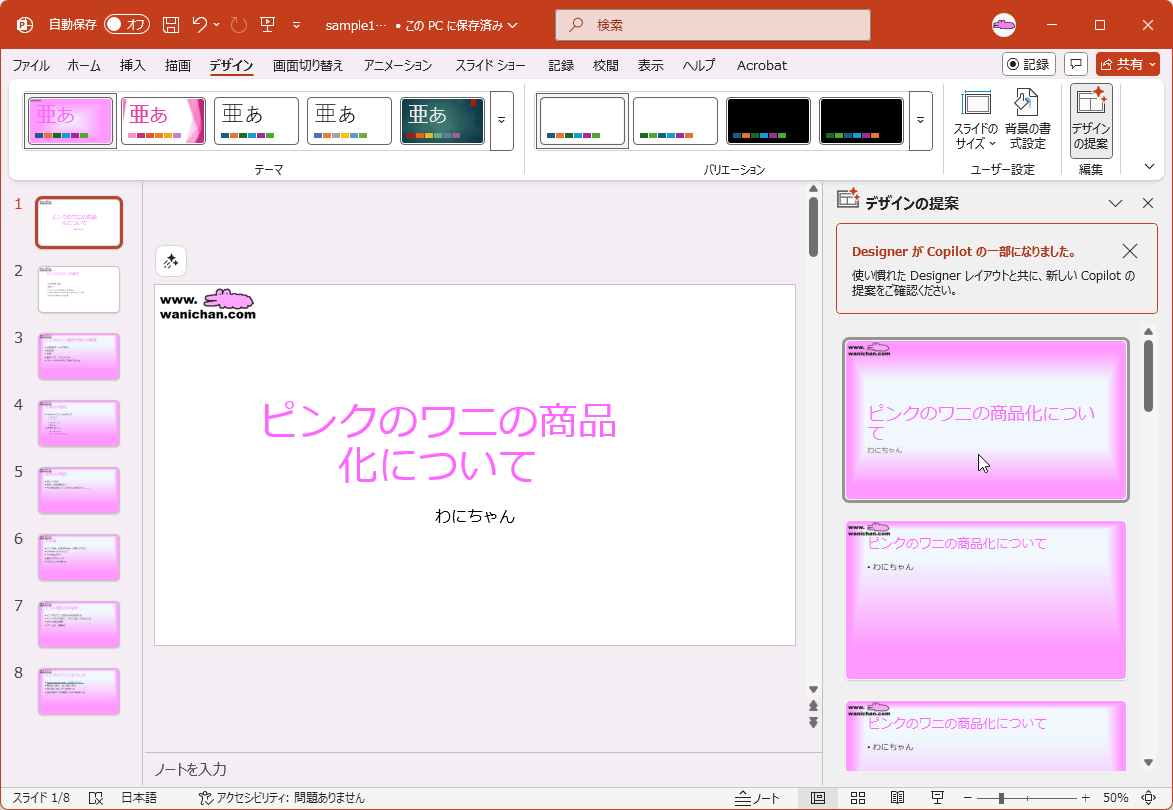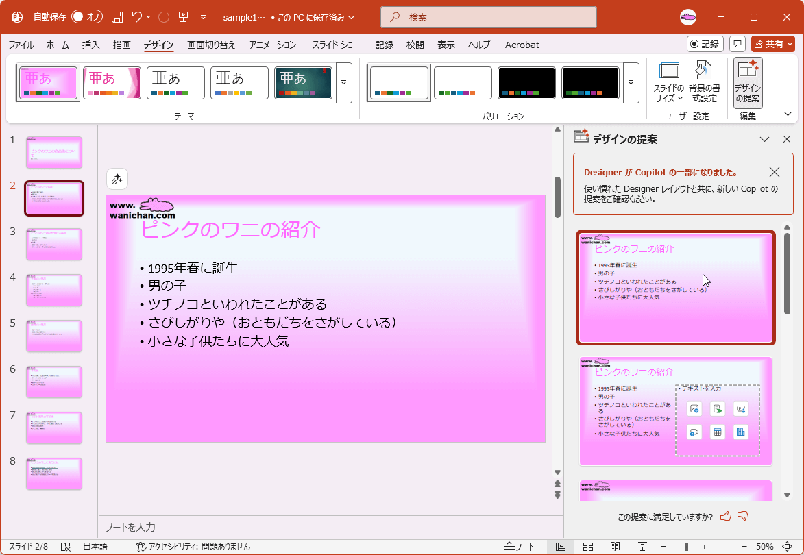 Copilotが有効になっている場合は、背景のグラデーションが適用されません。[デザインの提案]一覧から選択します。