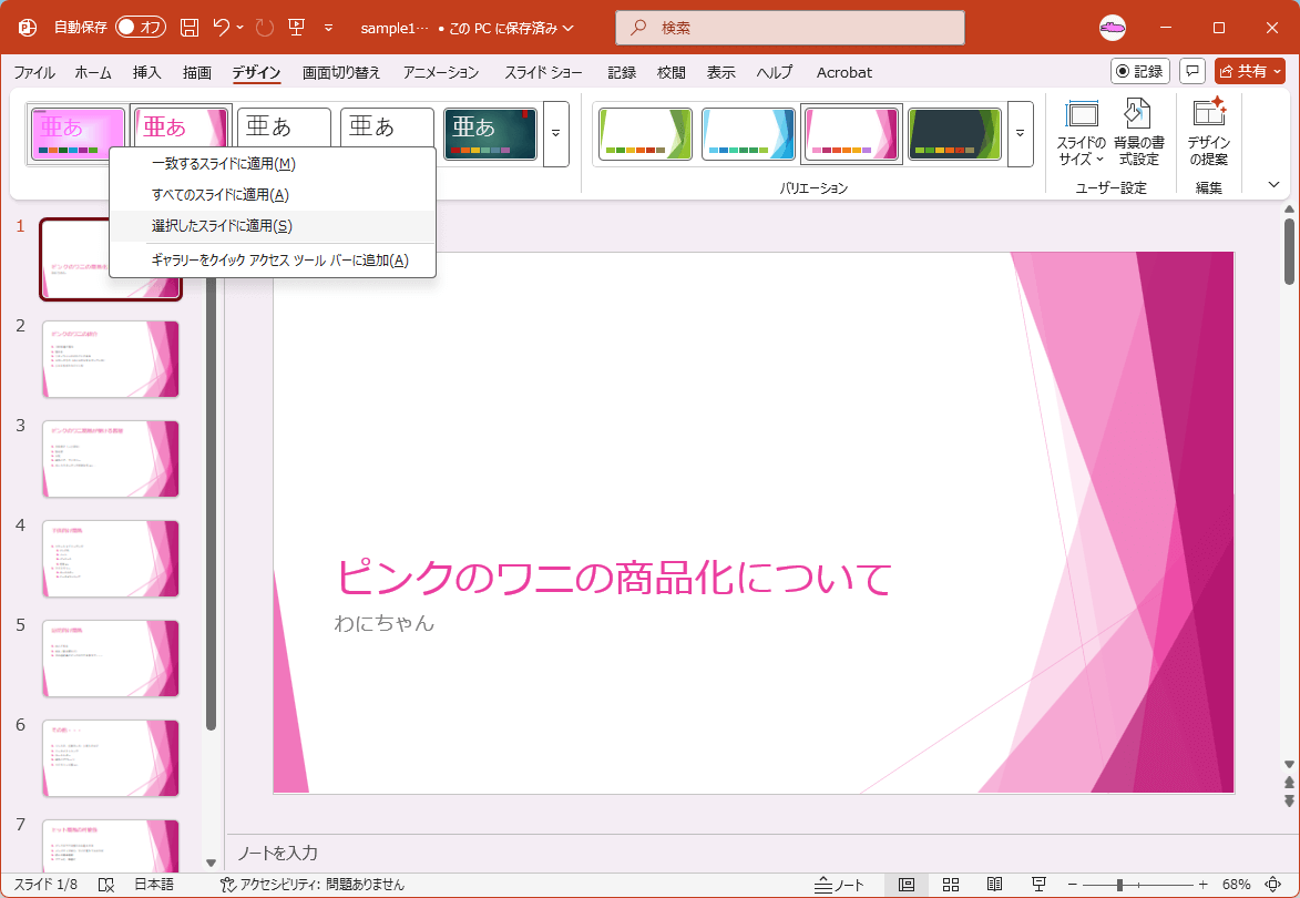 - [デザイン]タブを開き、適用したいテーマを右クリックしてショートカットメニューより[選択したスライドに適用]をクリックします。