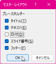 マスターレイアウトに含めるプレースホルダーを選択できます。既定ではタイトル、テキスト、日付、スライド番号、フッターすべて追加されています。
