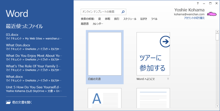 Office 2013バージョンから、Word、Excel、そしてPowerPoint起動時には空白のドキュメントが開かずにスタート画面が表示されるようになりました。