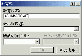 | 一番下側のセルにカーソルがあった場合 | =SUM(ABOVE) | 上側すべてを合計 |