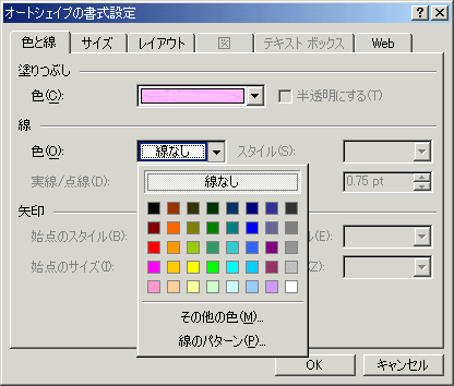 「色と線」タブを開き、下の図のように「線なし」にすればOKです。