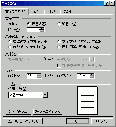 文字数と行数を指定したい場合は「文字数と行数を指定する」を選択して、それぞれ指定してください。 - 設定が終わったらOKボタンをクリックしてくださいね。