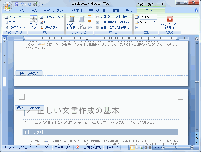 Word 2007で偶数ページを左寄せ、奇数ページを右寄せにヘッダーとフッターを別に設定する方法を紹介します。