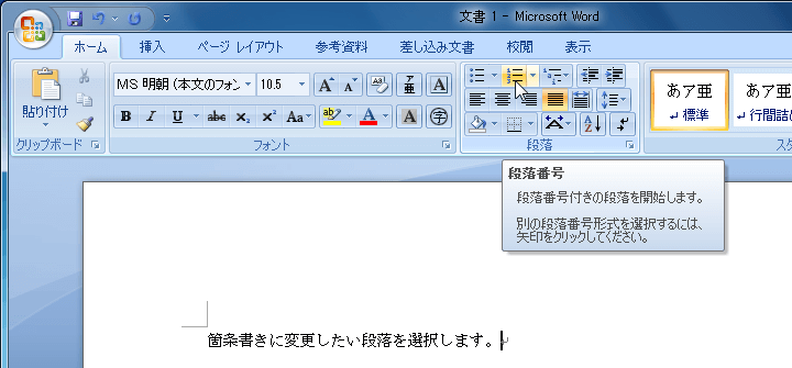- [ホーム]タブの[段落番号]ボタンをクリックします。