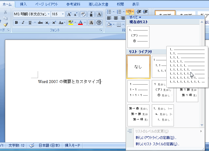 Word 2007で1-1、1-1-1、2…といったアウトラインスタイルにするには、[ホーム]タブの[アウトライン]ボタンを利用します。