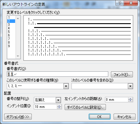 - [新しいアウトラインの定義]ダイアログボックスで、番号書式、このレベルに使用する番号の種類やインデントなどを設定して[OK]ボタンをクリックします。